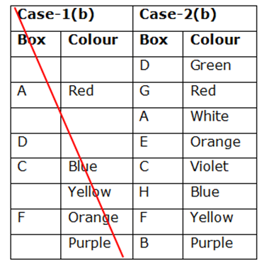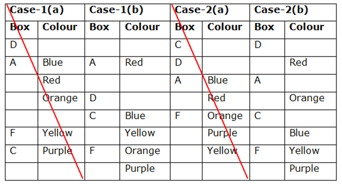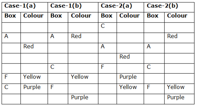 बॉक्स A और पीला रंग के बॉक्स के बीच केवल तीन बॉक्स रखे गए हैं। न तो बॉक्स A और न ही पीला रंग का बॉक्स या तो सबसे ऊपर या सबसे नीचे रखा गया। पीला रंग के बॉक्स के ऊपर दो से अधिक बॉक्स रखे गए हैं। पर्पल रंग के बॉक्स को बॉक्स F के ठीक नीचे रखा जाता है। बॉक्स F के नीचे रखे गए बॉक्सों की संख्या लाल रंग के बॉक्स के ऊपर रखे गए बॉक्सों की संख्या के समान है। लाल रंग के बॉक्स को सबसे नीचे नहीं रखा जाता है। केवल दो बॉक्स लाल रंग के बॉक्स और बॉक्स C के बीच रखे गए हैं। बॉक्स C पीला रंग में नहीं था। बॉक्स D और नारंगी रंग के बॉक्स जो बॉक्स D के नीचे रखा गया है के बीच दो बॉक्स रखे गए हैं। नारंगी और नीला रंग के बॉक्स के बीच केवल एक बॉक्स रखा गया है। बॉक्स A नीला रंग में नहीं है। बॉक्स E को सफ़ेद रंग के बॉक्स के ठीक नीचे रखा जाता है। बॉक्स B और सफ़ेद रंग के बॉक्स के बीच तीन से अधिक बॉक्स रखे गए हैं। बॉक्स E लाल रंग में नहीं है। बॉक्स C हरा रंग में नहीं है। बॉक्स G को बॉक्स C के ऊपर रखा गया है।