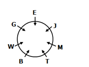 6) सात व्यक्ति B, E, G, J, M, T और W एक वृत्ताकार मेज में बैठे हैं और मेज के केंद्र का सामना कर रहे हैं। M के दायें ओर तीसरा कौन बैठता है?