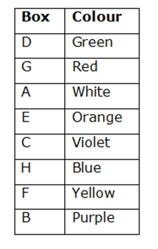 आठ बक्से A, B, C, D, E, F, G और H को एक के ऊपर एक रखा जाता है। ये सभी अलग-अलग रंगों में हैं जैसे कि बैंगनी, नीला, हरा, नारंगी, पीला, लाल, सफ़ेद और पर्पल लेकिन ये एक ही क्रम में हो आवश्यक नहीं है।