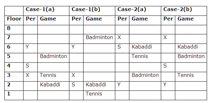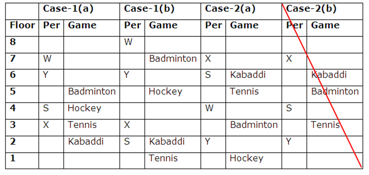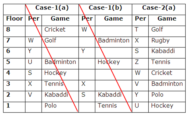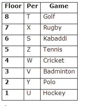 आठ व्यक्ति S, T, U, V, W, X, Y और Z एक आठ मंजिला इमारत के आठ अलग-अलग मंजिलों पर इस तरह से रह रहे हैं, जैसे ग्राउंड फ्लोर को एक के रूप में गिना जाता है, इसके ऊपर की मंजिल को दो गिना जाता है। और इसी तरह सबसे ऊपर की मंजिल को आठ गिना जाता है। उन्हें अलग-अलग खेल पसंद हैं जैसे पोलो, टेनिस, गोल्फ, हॉकी, कबड्डी, रग्बी, बैडमिंटन, और क्रिकेट लेकिन जरूरी नहीं कि ये एक ही क्रम में हो।