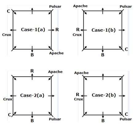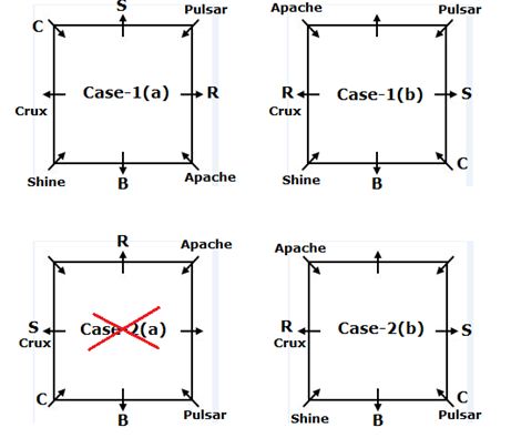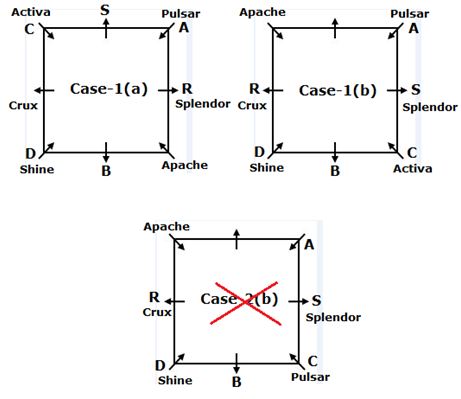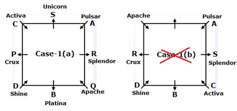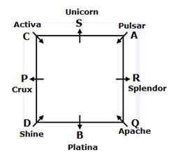 जिसके पास Crux है वह B के दाईं ओर दूसरे स्थान पर बैठता है, जो टेबल के किसी भी कोने पर नहीं बैठता है। केवल दो व्यक्ति उन व्यक्तियों के बीच बैठे हैं, जिसके पास Crux है और जिसके पास Pulsar है।जिसके पास Apache है वह R के ठीक दाएं ओर बैठता है । C Apache वाले के ठीक सामने बैठता है। R, B का तत्काल पड़ोसी नहीं है। Shine वाले व्यक्ति और S के बीच केवल दो व्यक्ति बैठे हैं, जो C का तत्काल पड़ोसी है। वह व्यक्ति जिसके पास Splendor है, D के दाईं ओर तीसरे स्थान पर बैठा है। A, जिसके पास Splendor है के तत्काल बाईं ओर बैठता है। केवल एक व्यक्ति A और जिसके पास Activa है के बीच बैठता है। जितने व्यक्ति A और, जिनके पास Crux है के बीच बैठे हैं उतने ही व्यक्ति, Q और जिसके पास Unicorn है के बीच बैठते हैं । D उस व्यक्ति का तत्काल पड़ोसी नहीं है जिसके पास Unicorn है।
