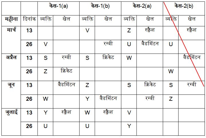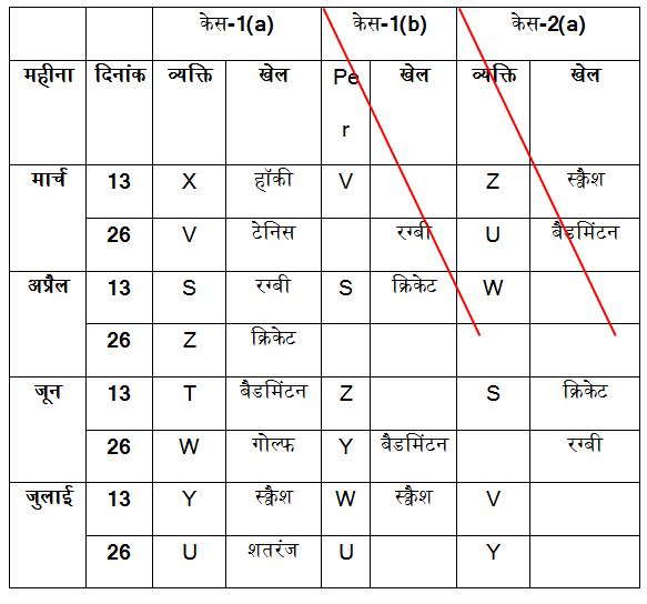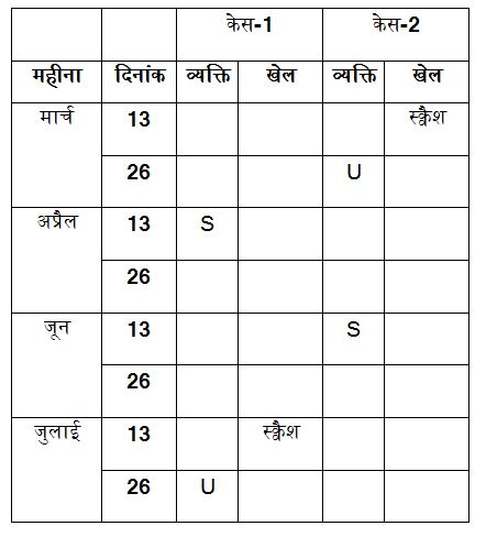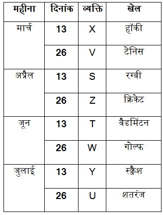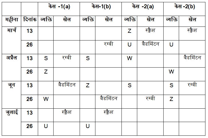 आठ व्यक्ति S, T, U, V, W, X, Y और Z एक ही वर्ष के मार्च, अप्रैल, जून और जुलाई सहित चार अलग-अलग महीनों की 13 और 26 तारीख को सेमिनार में भाग ले रहे हैं। उन सभी को क्रिकेट, शतरंज, गोल्फ, हॉकी, बैडमिंटन, स्क्वैश, टेनिस और रग्बी जैसे अलग-अलग खेल पसंद हैं, लेकिन इसी क्रम में हों यह जरुरी नहीं है।
