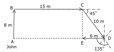 जॉन बिंदु A से बिंदु B तक पहुँचने के लिए बिंदु A से 8 मीटर उत्तर की ओर चलता है। बिंदु B से वह पूर्व की ओर मुड़ता है और बिंदु C तक पहुँचने के लिए 15 मीटर चलता है, बिंदु C से, जॉन अपने दाईं ओर 450 की ओर मुड़ता है और बिंदु D तक पहुँचने के लिए 10 मीटर चलता है। बिंदु D से वह 1350 दाईं ओर मुड़ता है और बिंदु E तक पहुंचने के लिए 6 मीटर चलता है।