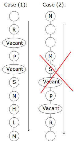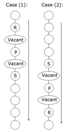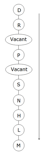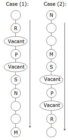 दक्षिण की ओर एक ऊर्ध्वाधर रेखा में 8 व्यक्ति खड़े हैं जिनमें 10 स्थान हैं। दो स्थान रिक्त हैं। रिक्त स्थान न तो आसन्न पदों पर हैं और न ही पंक्ति के दोनों छोर पर। R पंक्ति के अंत से दूसरे स्थान पर है। P, R से दो स्थान दूर खड़ा है। P और S के बीच कोई भी खड़ा नहीं है|N, M के उत्तर में तीसरे स्थान पर है; और उनमें से कोई एक पंक्ति के अंत में खड़ा है। P के निकटवर्ती स्थान पर कोई भी खड़ा नहीं है। L S के दक्षिण में तीसरे स्थान पर खड़ा है। H R का तत्काल पड़ोसी नहीं है। D आठ व्यक्तियों में से एक है।