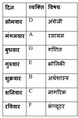 सात व्यक्ति A, B, C, D, E, F और G एक ही सप्ताह के सोमवार से रविवार तक सात अलग-अलग विषयों पर सेमिनार में भाग लेते हैं। सात विषय हैं, भौतिकी, रसायन, गणित, अंग्रेजी, कंप्यूटर, अर्थशास्त्र और नागरिक शास्त्र लेकिन समान क्रम में आवश्यक नहीं।