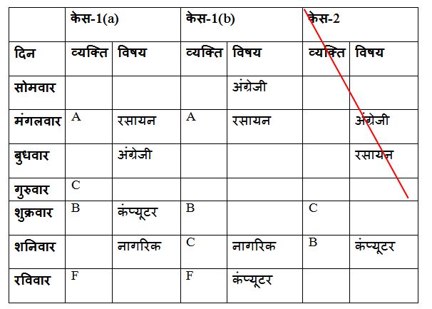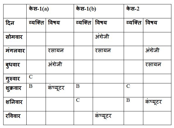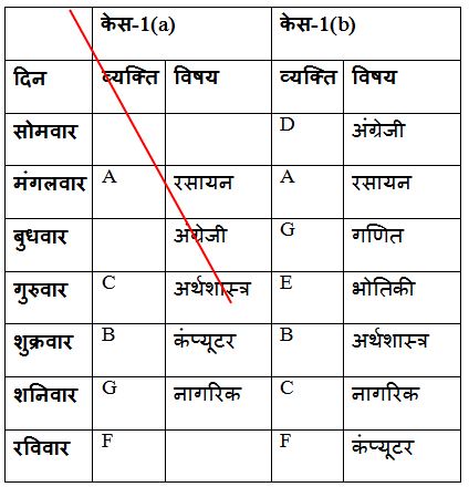 जो रसायन विज्ञान में भाग लेते हैं और B के बीच केवल दो व्यक्ति सेमिनार में भाग लेते हैं। B गुरुवार के बाद सेमिनार में भाग लेते हैं, लेकिन अंतिम दिन में नहीं। कंप्यूटर की सेमिनार में भाग लेने वाला व्यक्ति C के तत्काल बाद सेमीनार में भाग लेता हैं। कंप्यूटर की सेमिनार में भाग लेने वाले व्यक्ति के बाद सेमिनार में भाग लेने वाले व्यक्ति की संख्या, अंग्रेजी की सेमिनार में भाग लेने वाले व्यक्ति के पहले सेमिनार में भाग लेने वाले व्यक्ति की संख्या समान हैं। तीन व्यक्ति A और जो नागरिक शास्त्र में भाग लेता है, के बीच सेमिनार में भाग ले रहे हैं, जो A के बाद के किसी दिन में भाग लेता हैl F, नागरिक शास्त्र सेमिनार में भाग लेने वाले व्यक्ति के तत्काल बाद सेमिनार में भाग लेता है। केवल एक व्यक्ति G और वह व्यक्ति जो अर्थशास्त्र सेमिनार में भाग लेता है के बीच सेमिनार में भाग लेता है। G अंग्रेजी सेमिनार में शामिल नहीं होता है। E और जो अंग्रेजी सेमिनार में भाग लेता है के बीच सेमिनार में भाग लेने वाले व्यक्तिओ की संख्या, C और गणित सेमिनार में भाग लेने वाले के बीच सेमिनार में भाग लेने वाले व्यक्तिओ की संख्या समान है। B अंग्रेजी सेमिनार में शामिल नहीं होता है। C रसायन विज्ञान सेमिनार में शामिल नहीं होता है।