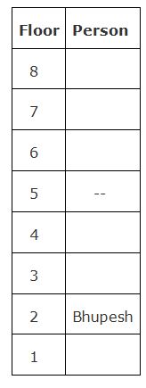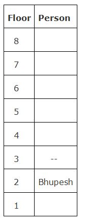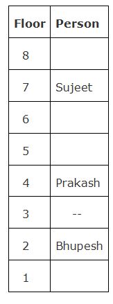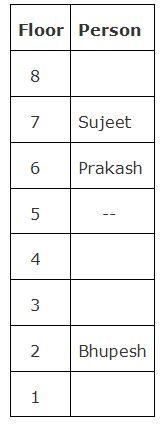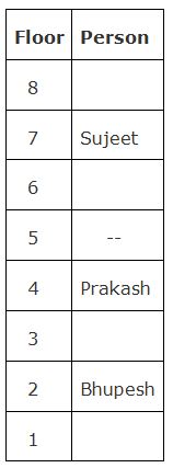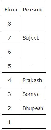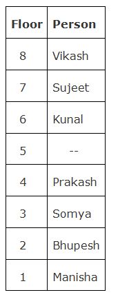 Seven persons namely, Kunal, Manisha, Somya, Sujeet, Bhupesh, Prakash and Vikash are living in a building that consists ofeight floors. The ground floor was numbered as 1 and immediate above one was numbered as 2 and so on. One of the floor is vacant.
