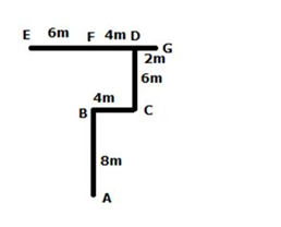Point B is 8m north of Point A. Point C is 4m east of Point B. Point D is 6m north of point C. Point E is 10m West of point D. Point F is 6m east of point E. Point G is 6m east of point F.