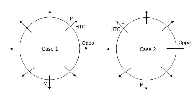 M sits second to the right of the one who buys Oppo. There are two persons sit between M and P, who buys HTC.