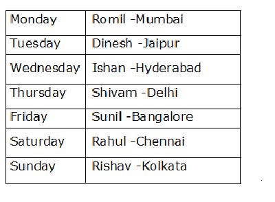 There are seven persons namely Sunil, Ishan, Rishav, Shivam, Dinesh, Romil and Rahul, they are playing match for seven different cities on seven different days of the week from Monday to Sunday but not necessarily in the same order. One person plays only one day and for only one city. They are playing for cities viz. Bangalore, Jaipur, Chennai, Kolkata, Mumbai, Hyderabad and Delhi.