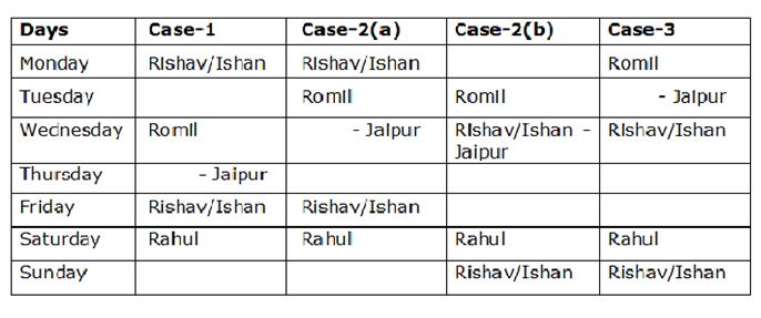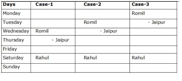 Rahul plays on Saturday. At least two persons play between Rahul and Romil. The one who plays for Jaipur play on immediate after Romil. Here we have following cases.