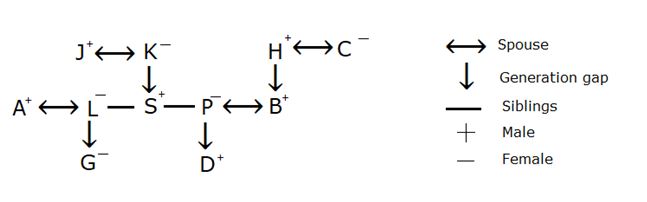 There are eleven members in a family. P is mother of D. S is son of J. A is son-in-law of J. K has only one son and two daughter. C is mother of B. P is daughter-in-law of H. K is mother of L. A is not married to P. C and H are married and has only son. S is unmarried. G is daughter of A. L and S are siblings. D is nephew of S.