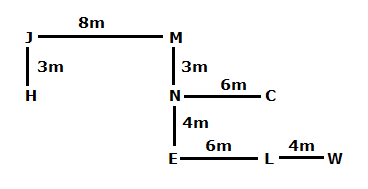 Point N is 6m to the west of point C. Point M is 8m to the east of point J which is 3m to the north of point H. Point N is 3m to the south of point M. Point E is 4m to the south of point N. Point L is 6m to the east of point E and 4m to the west of point W.
