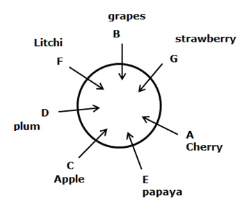 Seven persons A, B, C, D, E, F and G are sitting in a circular table and all of them facing towards center. They all like different fruits i.e. Grapes, Litchi, Apple, Papaya, Plum, Cherry and strawberry but not necessarily in the same order. A likes cherry and sits second right of C. Two persons sit between D and the one who likes strawberry and neither of them sits to the immediate right of C. E who likes papaya sits third left of the one who likes grapes. B and F are immediate neighbors of each other. Neither B nor F likes strawberry. The only one who likes plum sits between F and the one who likes apple. C likes apple.