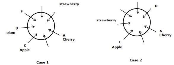 A likes cherry and sits second right of C. C likes apple. Two persons sit between D and the one who likes strawberry and neither of them sits to the immediate right of C. From the statements, we get case 1 and case 2.