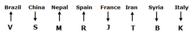 Only three persons are sitting between the one who belongs to China and T, who sits third from the either ends of the row. T does not face south. R sits second to the left of the one who belongs to China. Four persons are sitting between S and the one who belongs to Syria. S does not sit at any extreme ends of the row. Not more than two persons sitting adjacent are facing the same direction. Immediate neighbours of S face the same direction. The one who belongs to Spain sits third to the right of V, who does not face the same direction as S. T does not belong to Spain. J sits to the immediate right of the one who belongs to Spain. The one who belongs to Italy sits third to the left of J. The one who belongs to Iran sits immediate right of B. More than three persons sit between K and the one who belongs to Nepal, who does not sit at the extreme end. J does not belong to Brazil.K faces the same direction as B. The immediate neighbours of the one who belongs to Spain are facing opposite direction to each other.