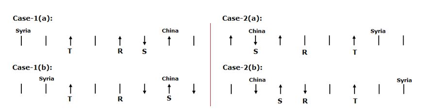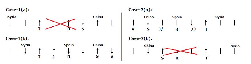 - Four persons are sitting between S and the one who belongs to Syria. S does not sit at any extreme ends of the row. Not more than two persons sitting adjacent are facing the same direction. Immediate neighbours of S face the same direction.