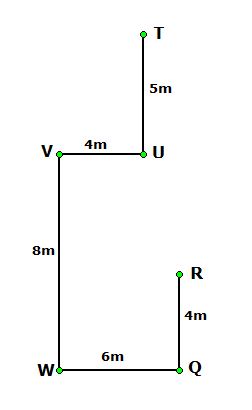 Kumar walks 5m towards south and reaches point U from point T. Then, he turns his right and walks for 4m to reach point V. Now he turns to his left and walks for 8m to reach point W. Then he turns to his left and walks for 6m and reaches point Q. Finally he took a left and walks for 4m to reach point R.