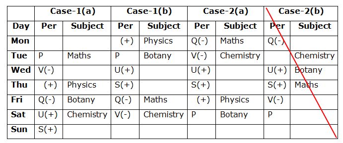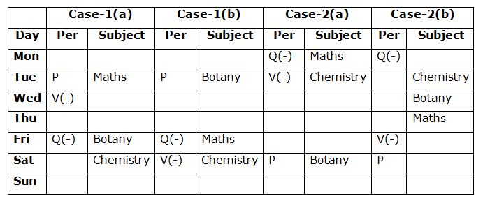 • V attends the exam immediately after the one who attends the Maths exam and she does not attend the Botany exam. As many persons attend the exams before V is same as after the one who attends the Botany exam. V does not attend the exam on last day of the week.