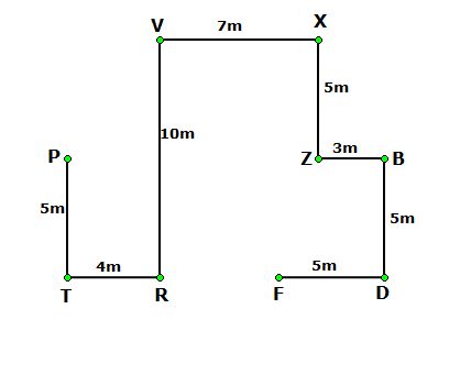 Point B is 5m to the north of point D, which is 5m to the east of point F. Point Z is 3m to the west of point B. Point X is 5m to the north of point Z. Point V is 7m to the west of point X and 10m to the north of point R. Point T is 4m to the west of point R. Point T is 5m to the south of point P.