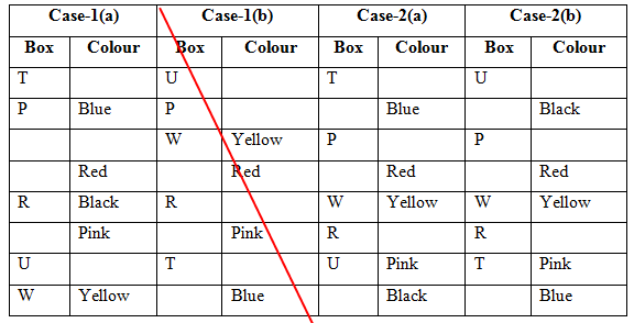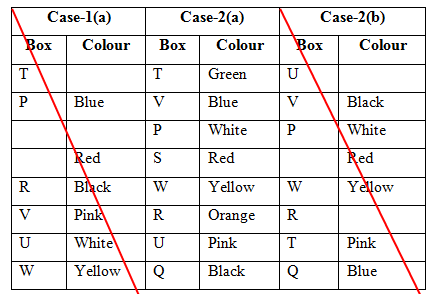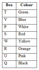 Eight boxes P, Q, R, S, T, U, V and W are in different colours viz., Pink, Blue, Black, White, Red, Green, Orange and Yellow but not necessary in the same order. The boxes are arranged one above another in a stack.