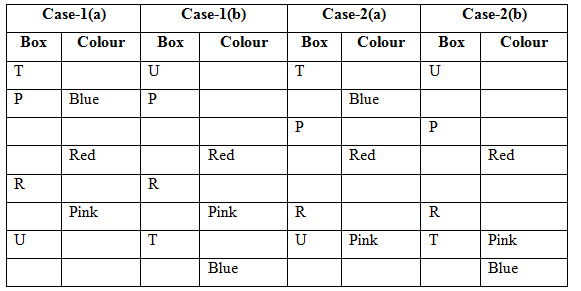 - The Blue coloured box is kept immediately below the box T. As many boxes are kept above the Blue coloured box is same as below the box U. Only two boxes are kept between the box U and the Red coloured box.