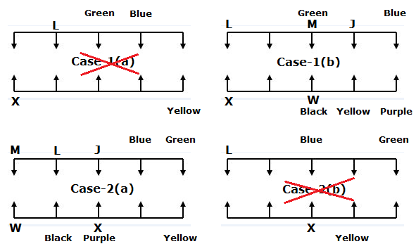 - The one who likes Black sits opposite to the person who sits immediate right of J. Neither J nor the one who likes Black sits at the any extreme ends of the rows.