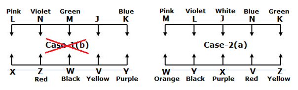 Ten persons are sitting in two parallel rows with equal distance from each other and the person in one row faces the person sitting in another row. In row -1, J, K, L, M and N are sitting and all of them are facing south. In row-2, V, W, X, Y and Z are sitting and facing north. They all are like different colours viz., Orange, Purple, Yellow, Blue, Violet, Black, Red, Green, White and Pink but not necessary in the same order.