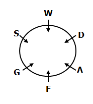 10) Six persons G, D, S, A, W and F are sitting around a circular table facing centre. Who sits third to the right of F?
