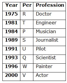 Eight persons P, Q, R, S, T, U, V and W are born in different years viz., 1975, 1981, 1984, 1989, 1991, 1993, 1996 and 2000. They all belongs to different profession viz., Journalist, Engineer, Painter, Doctor, Pilot, Scientist, Musician and Actor but not necessary in the same order. Their ages were calculated based on the year 2018.