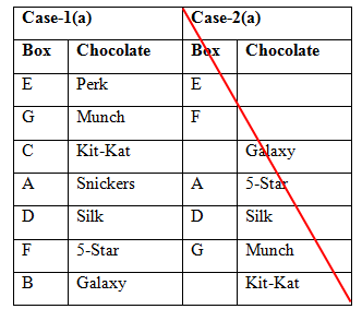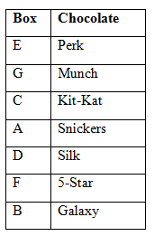 • Only one box is kept between the boxes G and A. The box A does not have Munch. As many boxes are kept between the box F and the box has Snickers is same as between the box C and the box has Silk. The box C does not have Galaxy.