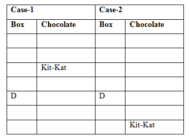 • Only two boxes are kept below the box D. Only one box is kept between the box D and the box which has Kit-Kat.