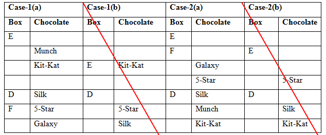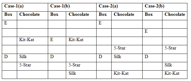 • Two boxes are kept between the box which has Kit-Kat and the one has 5-Star. Three boxes are kept between the box E and the box which has Silk, which is kept below the box E.