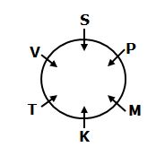 6) Six persons K, M, P, S, T and V are sitting in a circular table. Who among them sits second to the left of M?