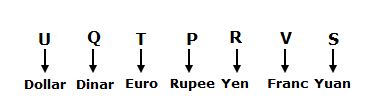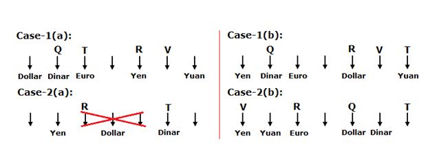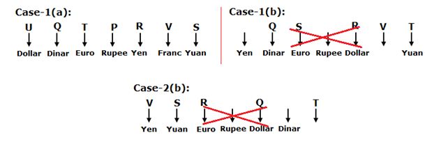 • The one who likes Yuan sits immediate left of V. Three persons are sitting between V and Q. V does not like Dinar.