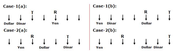 • The one who likes Dollar sits second to the right of T. T is not an immediate neighbour of R. As many persons sitting to the right of T is same as the persons sitting to the left of the one who likes Yen.
