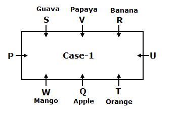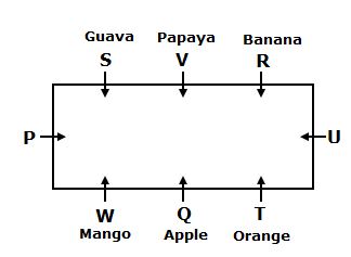 आठ व्यक्ति P, Q, R, S, T, U, V और W आयताकार मेज में इस तरह से बैठे हैं कि उनमें से तीन प्रत्येक बड़ी भुजा पर और एक उनमें से प्रत्येक छोटी भुजा पर बैठता है। उनमें से प्रत्येक मेज में विपरीत बैठे व्यक्ति का सामना करता है। जो लोग बड़ी भुजा पर बैठे हैं वे अलग-अलग फलों जैसे सेब, केला, अमरूद, आम, ऑरेंज और पपीता पसंद करते हैं, लेकिन एक ही क्रम में आवश्यक नहीं हैं।