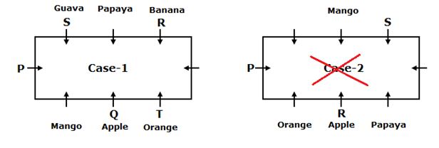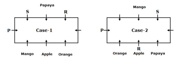 - The one who likes Orange sits diagonally opposite to S. The one who likes Papaya sits immediate right of R. Two persons are sitting between the one who likes Papaya and the one who likes Mango.