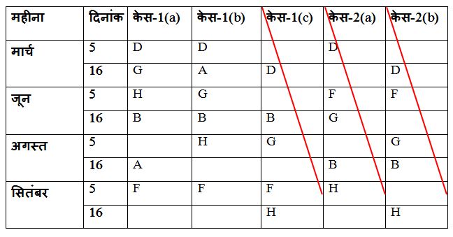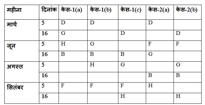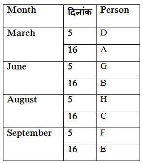 - A और H के बीच दो व्यक्ति पैदा होते हैं। A उस महीने में पैदा नहीं होता है, जिस महीने में सम संख्या में दिन हैं।