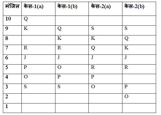- Q और R के बीच रहने वाले लोगों की संख्या R और O के बीच रहने वाले लोगों की संख्या के समान है। Q R के नीचे नहीं रहता है| O सबसे नीचे के मंजिल पर नहीं रहता है।