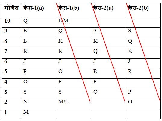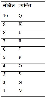- Q और L के बीच रहने वाले लोगों की संख्या S और M के बीच रहने वाले लोगों की संझ्या के समान हैं| N विषम क्रमांकित मंजिल पर नहीं रहते हैं।