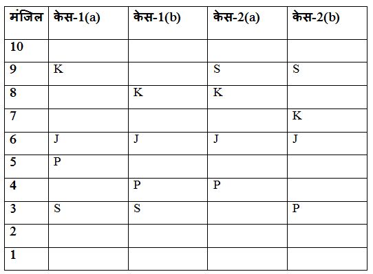 - K और P के बीच तीन लोग रह रहे हैं, जो K के नीचे के मंजिल में से एक में रहता है, P सबसे नीचे की मंजिल पर नहीं रहता है।