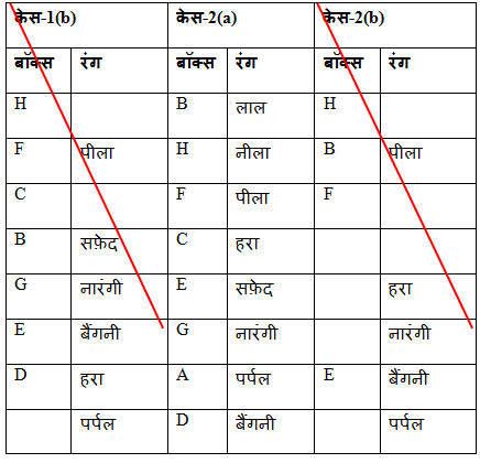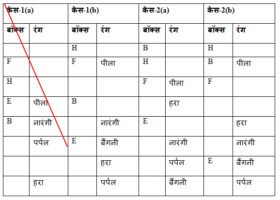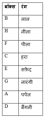 आठ बक्से A, B, C, D, E, F, G और H को एक स्टैक में एक के ऊपर एक रखा जाता है। बक्से अलग-अलग रंगों में थे। बैंगनी, सफेद, लाल, नीला, पर्पल, हरा, पीला और नारंगी लेकिन एक ही क्रम में आवश्यक नहीं।