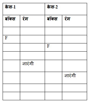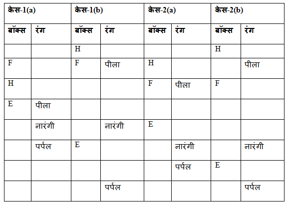 पीले रंग का बॉक्स बॉक्स H के ठीक नीचे रखा जाता है। बॉक्स G और D के बीच केवल एक बॉक्स रखा जाता है। बॉक्स F और नारंगी रंग के बॉक्स के बीच केवल दो बॉक्स रखे जाते हैं। दो से अधिक बक्से बॉक्स F के ऊपर नहीं रखे जाते हैं, जो सबसे ऊपर नहीं रखा जाता है। बॉक्स E और पर्पल रंग के बॉक्स के बीच केवल एक बॉक्स रखा जाता है, जिसे बॉक्स E के नीचे रखा जाता है।  पर्पल रंग के बॉक्स के नीचे रखे गए बॉक्स की संक्या, बॉक्स H के ऊपर रखे गए बॉक्स की संख्या के समान है। बॉक्स E को बॉक्स F के नीचे रखा जाता है। बॉक्स B और हरे रंग के बॉक्स के बीच दो बॉक्स रखे गए हैं, जो बॉक्स B के नीचे रखा गया है। बॉक्स E हरे रंग में नहीं है। बॉक्स H और बैंगनी रंग के बॉक्स के बीच तीन से अधिक बॉक्स रखे गए हैं। सफेद रंग का बॉक्स बॉक्स C के ठीक नीचे रखा जाता है। बॉक्स D नारंगी रंग में नहीं है। बॉक्स C न तो लाल रंग में है और न ही नीले रंग में। बॉक्स H लाल रंग में नहीं है।