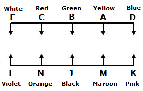 दस व्यक्ति दो समानांतर पंक्तियों में बैठे हैं, जिनमें प्रत्येक पंक्ति में पाँच लोग एक दूसरे से समान दूरी के साथ हैं। पंक्ति -1 में A, B, C, D और E बैठे हैं और पंक्ति -2 में दक्षिण की ओर, J, K, L, M और N बैठे हैं और उत्तर की ओर मुंह करके बैठे हैं। वे सभी अलग-अलग रंगों जैसे, बैंगनी, गुलाबी, नीले, सफेद, लाल, मरून, हरा, काले, नारंगी और पीले रंग को पसंद करते हैं लेकिन एक ही क्रम में आवश्यक नहीं हैं।
