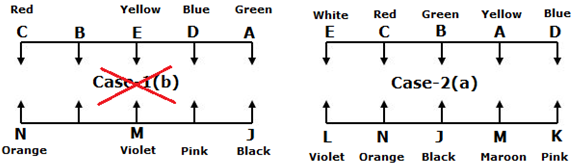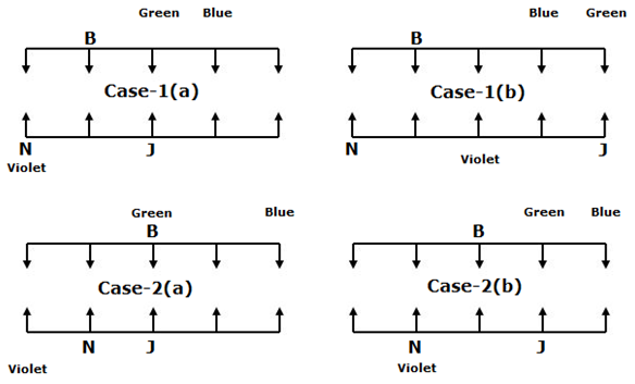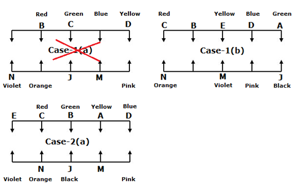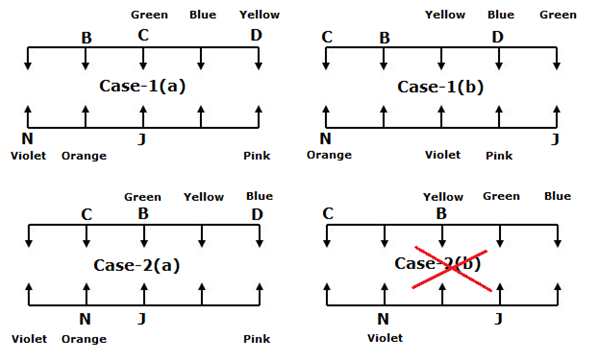 वह व्यक्ति जो नीला पसंद करता है, वह व्यक्ति N के दाईं ओर बैठता है। केवल एक व्यक्ति B और नीला पसंद करने वाले व्यक्ति के बीच बैठता है। हरा पसंद करने वाल व्यक्ति बैंगनी पसंद करने वाले व्यक्ति के विपरीत दूसरा दायाँ बैठता है। केवल एक व्यक्ति J और जो वायलेट पसंद करता है के बीच बैठता है। जो पीला पसंद करता है वह C के बाईं ओर दूसरा बैठता है। जो गुलाबी पसंद करता है वह नारंगी पसंद करने वाले के दाईं ओर तीसरा बैठता है। D, गुलाबी पसंद करने वाले के विपरीत बैठता है। D को हरा पसंद नहीं है। केवल एक व्यक्ति M और लाल पसंद करने वाले के सामना करने वाले व्यक्ति के बीच बैठता है। B को लाल पसंद नहीं है। वह व्यक्ति जो काला को पसंद करता है वह उस व्यक्ति के विपरीत बैठता है जो E के बाईं ओर दूसरा बैठता है। L M का तत्काल पडोसी नहीं है l E को मैरून पसंद नहीं करता है।