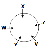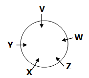 6) पांच दोस्त V, W, X, Y और Z एक गोलाकार टेबल पर बैठे हैं और केंद्र की ओर मुंह किए हुए हैं। W और X के बीच कौन बैठता है?