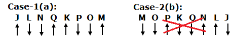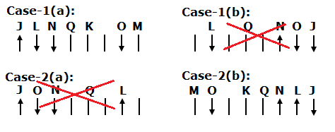 Q, L के बाईं ओर दूसरा बैठता है, जो पंक्ति के दोनों छोरो से दूसरा बैठता है। Q और O के बीच केवल दो व्यक्ति बैठे हैं, जो पंक्ति के अंतिम छोर पर नहीं बैठते हैं। O का सामना उत्तर की ओर नहीं है। N, J के दायें से दूसरे स्थान पर बैठता है, जो पंक्ति के अंतिम छोरो में से एक पर बैठता है। N और J एक ही दिशा का सामना नहीं करते हैं। N के तत्काल पड़ोसी एक दूसरे के विपरीत दिशाओं का सामना करते हैं। M, K के दाईं ओर तीसरे स्थान पर बैठता है, जो O का तत्काल पड़ोसी नहीं है। अंत पर बैठे व्यक्ति एक ही दिशा का सामना कर रहे हैं। P, N के समान दिशा का सामना करता है। P के तत्काल पड़ोसी विपरीत दिशाओं का सामना करते हैं।