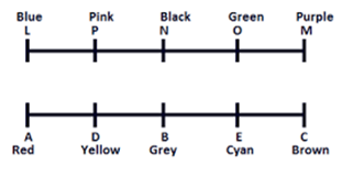 L sits one of the end of the row. P sits third to the right of M and one of them sits at the end of the row. The immediate neighbour of P faces the one who likes Grey colour. C does not face the one who likes Black colour. O likes Green colour and faces the one who likes Cyan colour. E, sits 2nd to the right of the one who likes Yellow. L, likes Blue colour and his immediate neighbour faces the one who likes Yellow colour. O faces the one who sits third to the right A. D sits third to the left of the one who likes Brown colour. N likes Black colour. Two persons sits between the one who likes Pink and the one who likes Purple colour. D does not face the one who likes Purple colour. B does not like Red colour.