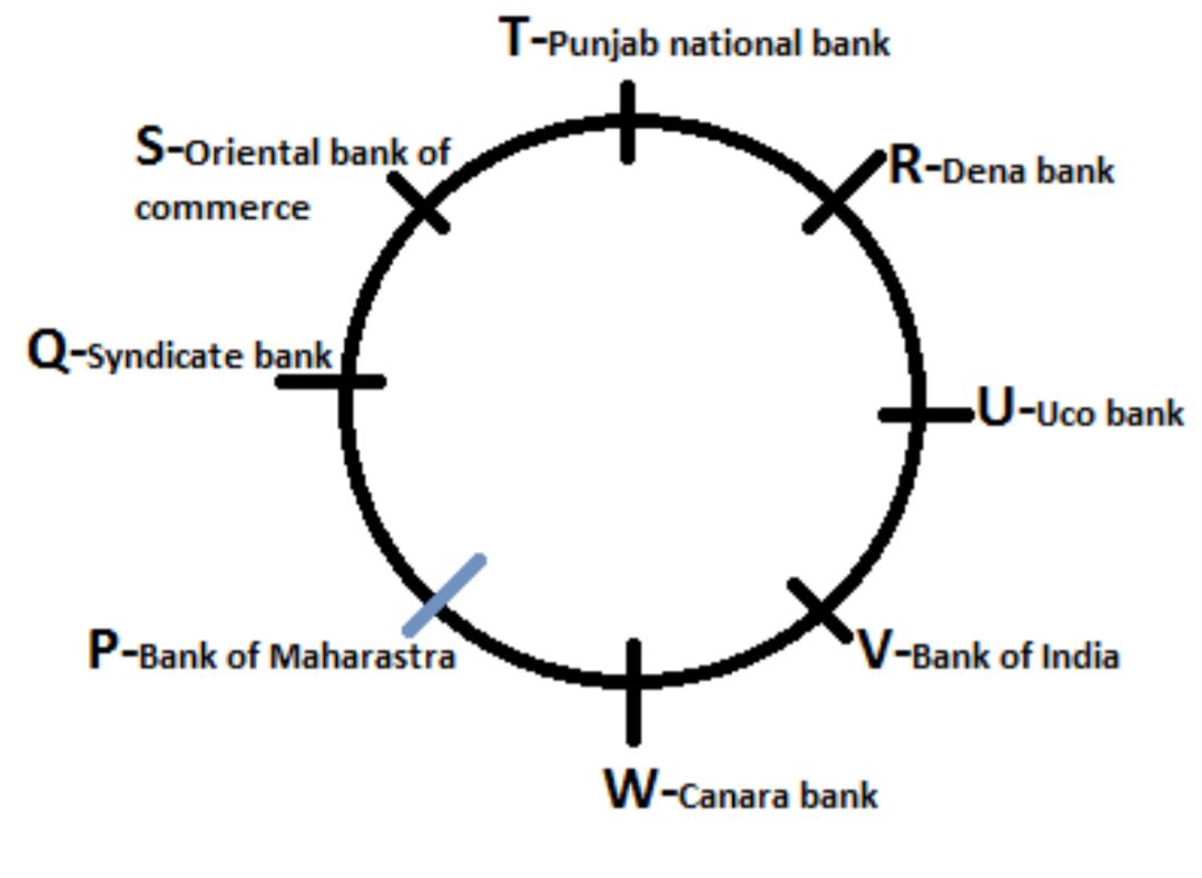 Eight persons, viz P, Q, R, S, T, U, V and W, are sitting around a circular table, facing the centre, but not necessarily in the same order. Each one of them have a different bank accounts, like UCO Bank, Oriental Bank of Commerce, Bank of Maharashtra, Canara Bank, Syndicate Bank, Punjab National Bank, Bank of India and Dena Bank.